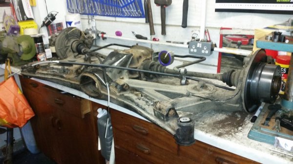 The rear beam has been dropped off for the old bushes to be pressed out and the new ones pressed in.